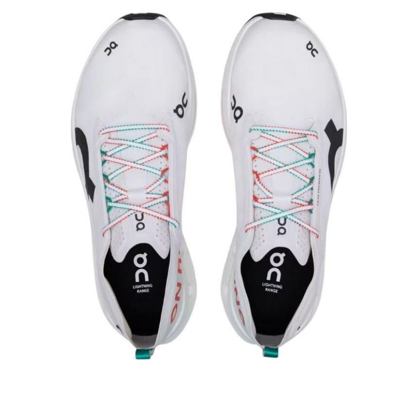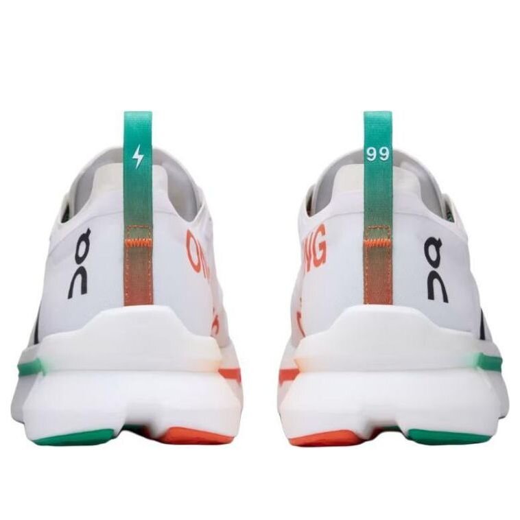 On Cloudboom Zone: White/Flame. High-performance running shoe blending sleek design and advanced technology. Carbon fiber plate & Helion superfoam deliver